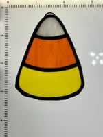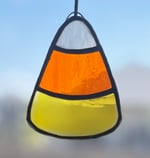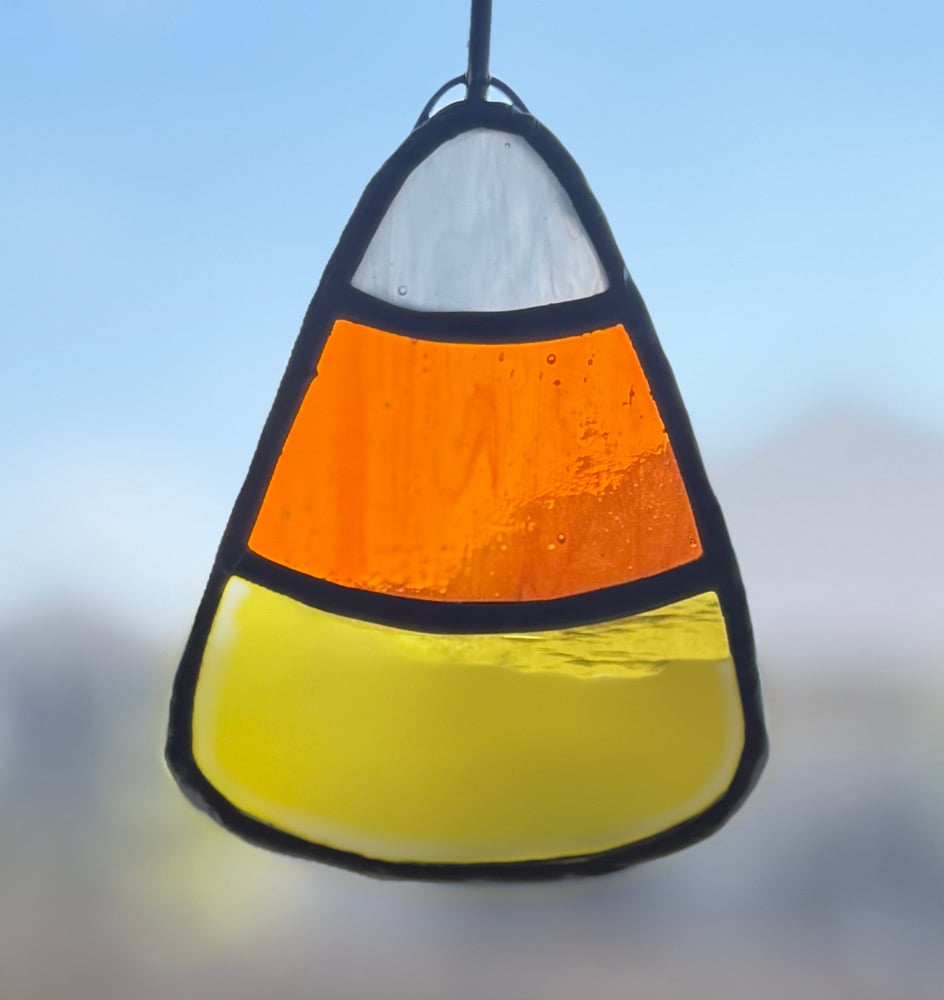 A Halloween classic turned into stained glass art. This handmade candy corn suncatcher is made from smooth translucent glass in warm yellow, bright orange, and soft white with cloudy wisps that gently filter the light. When sunlight hits, it glows with cozy fall colors that instantly feel festive.