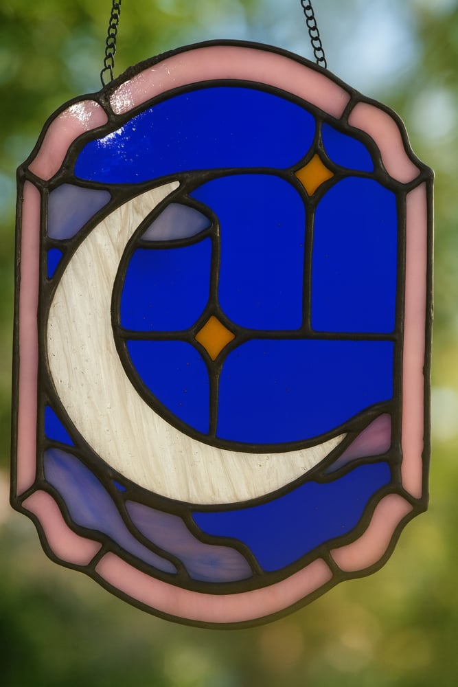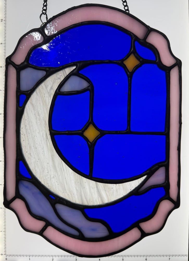 This handmade stained glass suncatcher features a soft celestial design with a glowing crescent moon surrounded by golden stars, drifting purple clouds, and framed in a pink border. The deep blue translucent background lets light shine through beautifully, while the mix of opaque and iridescent glass adds texture and depth.