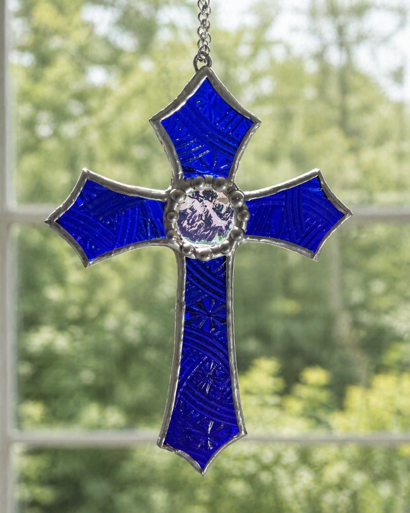 This handmade stained glass cross features rich cobalt blue textured glass with bold color and depth. The clear iridescent glass center is accented with decorative solder detail.
