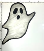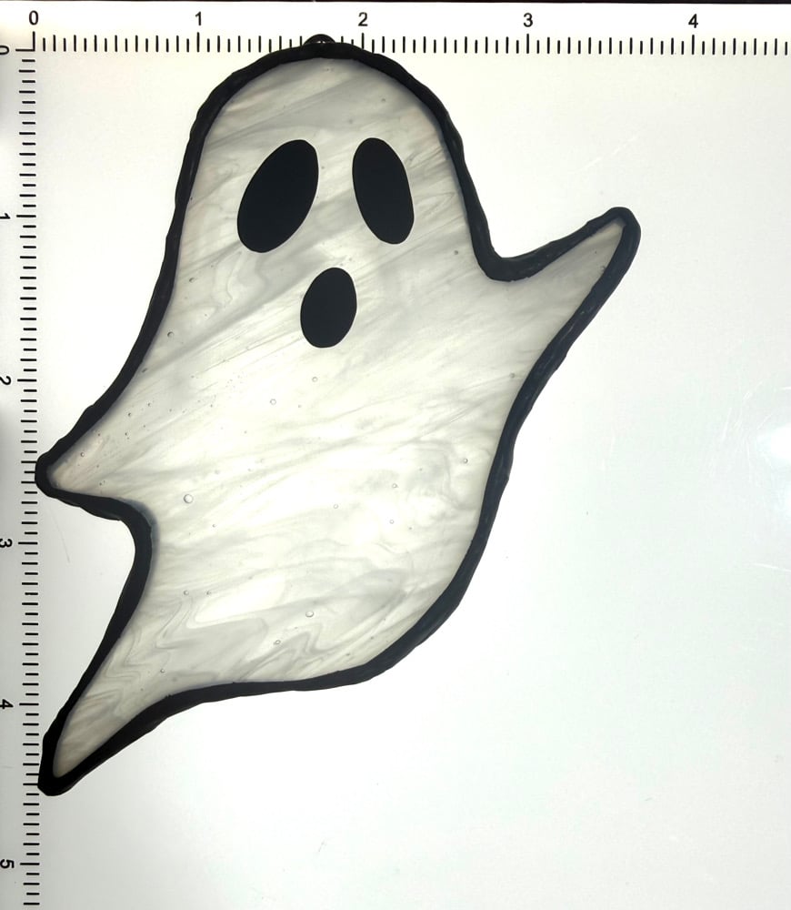This handmade stained glass ghost has a classic haunted look with a simple, flowing shape and expressive vinyl details. Crafted from white wispy translucent glass, it lets light shine through while keeping a soft, eerie glow. Finished with black patina, it’s perfect for spooky season displays or year-round ghostly charm.