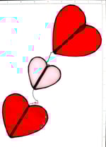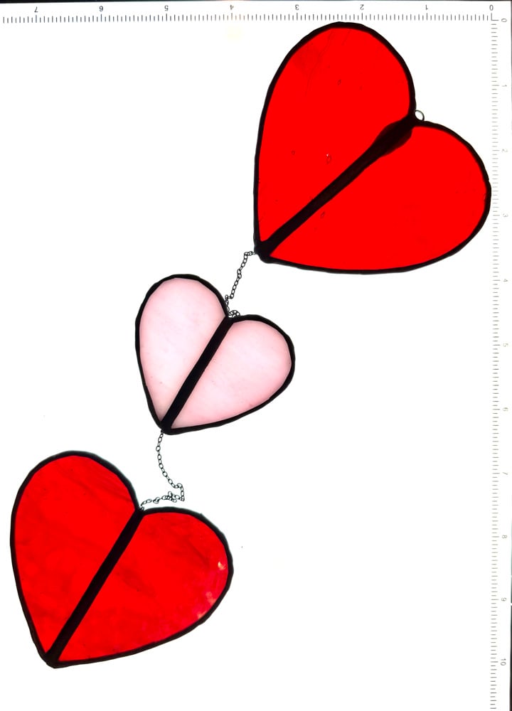 This stained glass suncatcher features three hanging hearts in vibrant red and soft blush pink, framed in bold black patina. The simple stacked design allows each heart to catch the light individually, creating a playful cascade of color that glows beautifully in a sunny window.