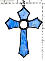 This handmade stained glass cross features soft light blue glass with a clear iridescent glass center. The clean design and natural solder finish give it a simple, classic look with a subtle shimmer from the center.
