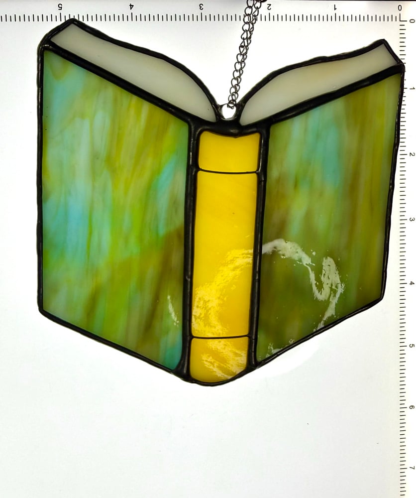 This handmade stained glass suncatcher features an open book design with a bright yellow spine and soft marbled glass pages. The main book glass has a blend of yellow, blue, and green opaque glass, while the white translucent glass along the top gives the piece the look of open paper catching the light.