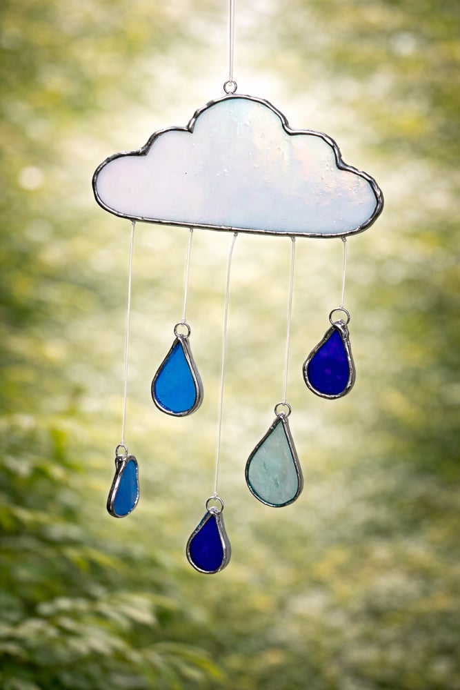 This handmade stained glass suncatcher features a soft, rounded cloud with delicate raindrops suspended beneath it. The cloud is crafted from luminous iridescent white glass that catches shifting light and gives off subtle rainbow tones as the sun moves across it. Hanging below the cloud are five raindrops in varying shades of blue, each one made from translucent textured glass that glows beautifully when backlit.