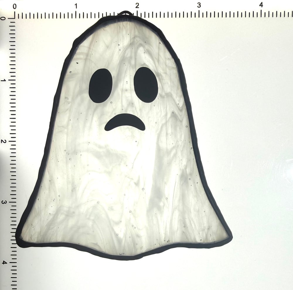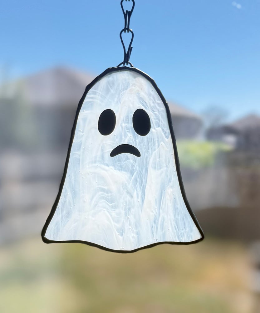 This little stained glass ghost has a quiet charm with a soft, moody expression. Made from white wispy translucent glass, it glows beautifully in the light while keeping that classic ghostly feel. Finished with black patina, it’s the perfect mix of spooky and sweet.